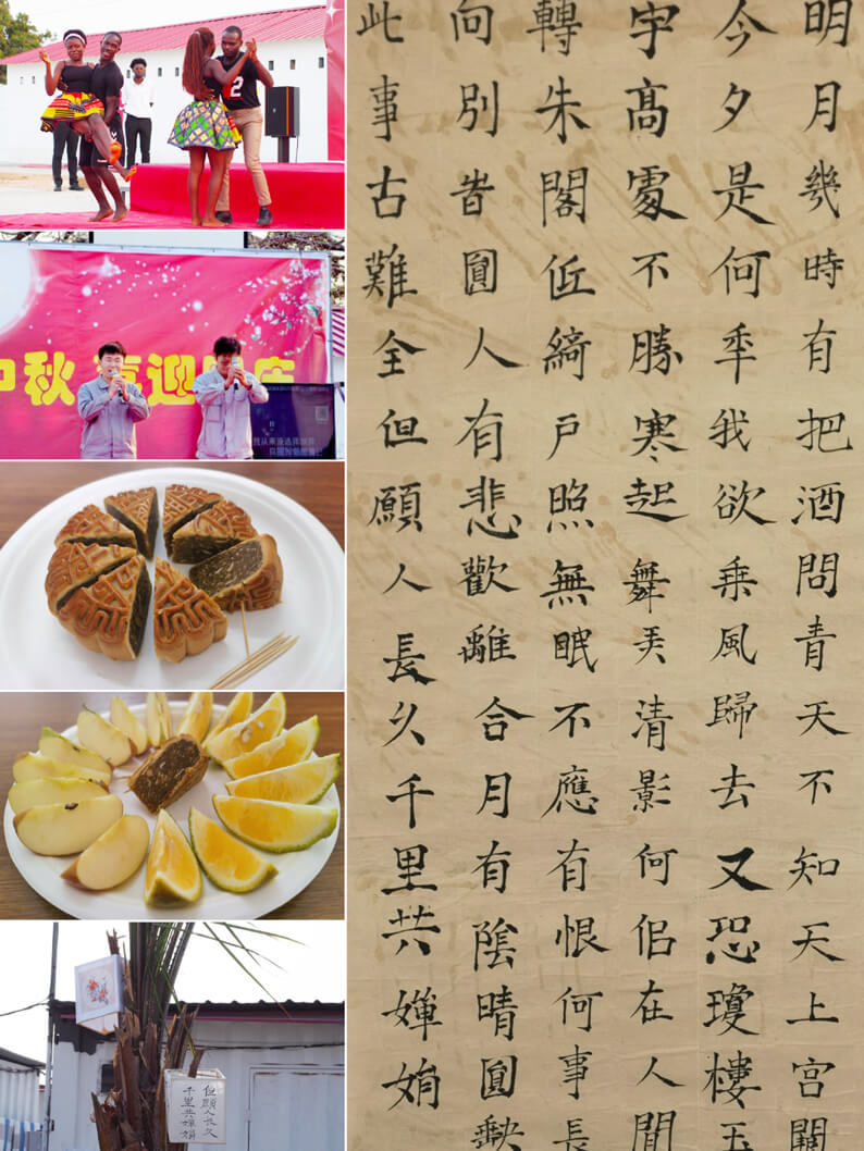 有限公司为员工们准备了月饼、桂花糕等中秋美食,活动现场还精心布置了富含中国传统文化元素的水墨艺术灯笼,玉兔、月亮造型的折纸以及诗词字画等装饰。联欢活动精彩纷呈,中国籍员工表演相声、演唱原创歌曲,安哥拉籍员工跳起了民族舞蹈。持续数小时的活动中,现场欢声笑语不断、掌声雷动,两国员工共同举行的大合唱、开展的运动游戏等节目将现场气氛不断推向高潮。有限公司负责人还贴心地为安哥拉籍员工家属送上了节日礼物,展现公司对外籍员工的关心与关爱。活动结束后,有限公司负责人、业主和总包现场经理等高层与大家合影留念。