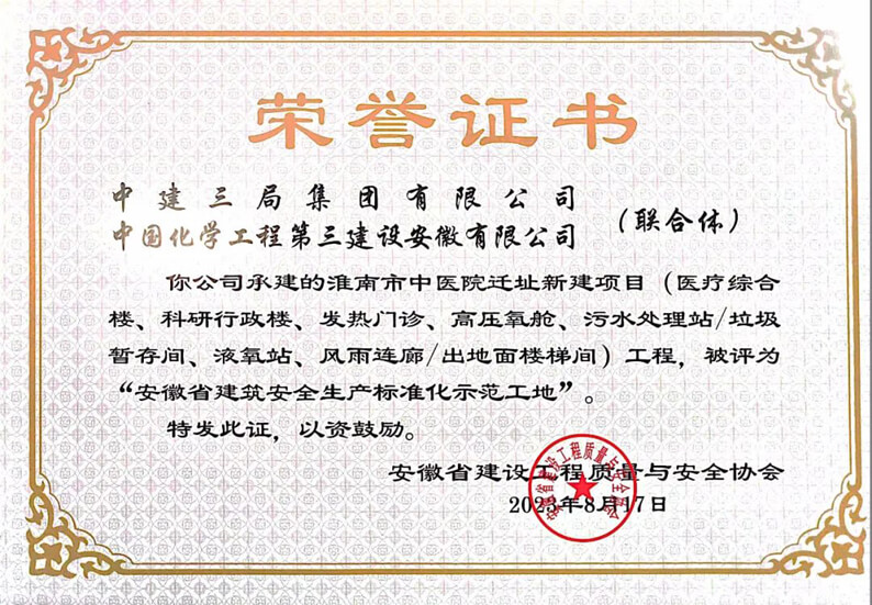 近日,安徽省建设工程质量与安全协会公布2023年度第二批“安徽省建筑安全生产标准化工地”名单,安徽有限公司与中建三局集团有限公司组建的联合体承建的淮南市中医院迁址新建项目榜上有名。