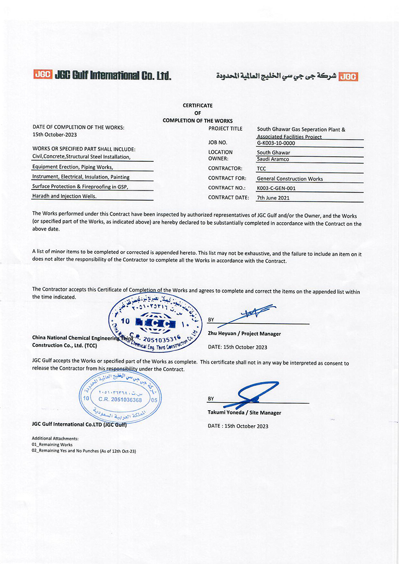 沙特南加瓦项目实现机械竣工,充分展示了公司在疫情等极端条件下海外项目的执行和保障能力,为公司不断巩固和拓展沙特市场奠定了坚实基础。沙特现场全体参战员工将以南加瓦项目机械竣工为新起点,再接再厉、乘势而上、加压奋进,为公司加快打造“两商”、创建“四新”现代新国企、建设国际一流工程公司贡献力量,以实际行动向集团公司成立70周年献礼。