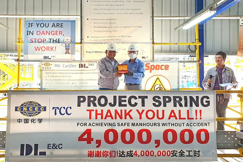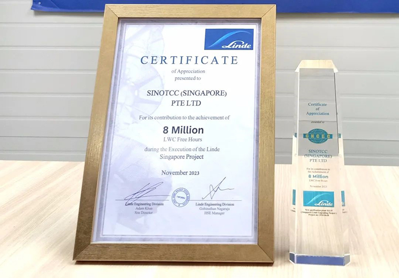 新加坡有限公司负责人受邀参加林德公司组织的林德气化项目现场安全巡检活动,业主对项目安全管理取得的成效予以充分肯定,对项目全体参战员工付出的努力表示衷心感谢,授予分公司800万安全工时奖杯、奖牌。在新加坡医用橡胶项目400万安全工时庆典活动中,大林公司代表对新加坡分公司安全管理取得的成绩表示祝贺,对现场全体参战员工安全高效推进项目建设表示感谢,授予分公司400万安全工时奖牌,对项目优秀管理人员和员工进行了表彰。