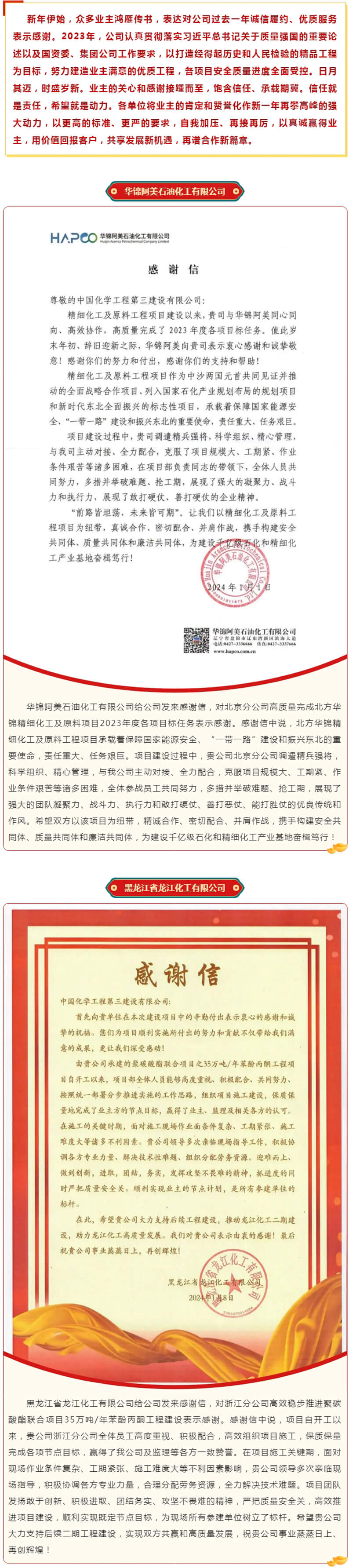 新面貌 新启航|华锦阿美石化和黑龙江龙江化工业主给公司发来感谢信