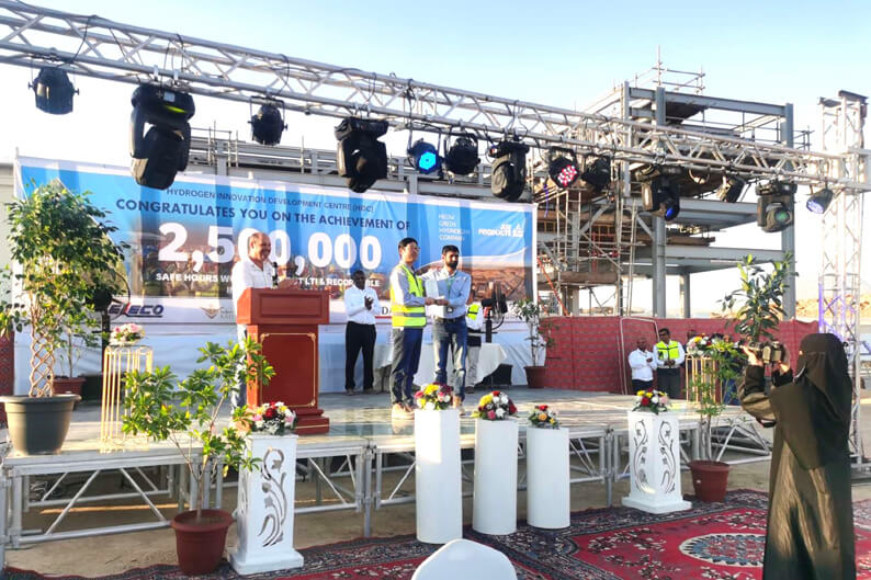 近日,米兰平台沙特分公司承建的沙特尼奥姆HIDC绿氢中试项目举行250万安全工时庆祝仪式。业主沙特尼奥姆绿氢公司(NEOM Green Hydrogen Company)、总包美国空气产品公司(Air Products)参加庆祝仪式。