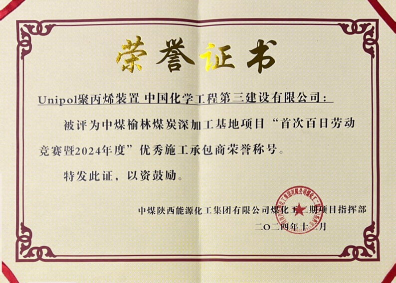 近日,米兰平台内蒙古分公司承建的中煤榆林煤炭深加工基地项目Unipol聚丙烯装置土建工程荣获中煤陕西能源化工集团有限公司首次百日劳动竞赛暨2024年度“优秀施工承包商”称号。