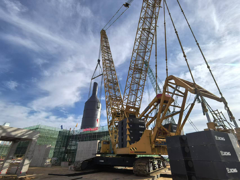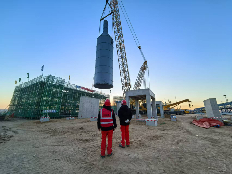 自11月底接到吊装通知后,分公司快速反应、积极筹备,依据设备参数及场地条件,经过3次模拟测算,确定最佳吊车型号与站位。此次吊装设备空分装置水冷塔高29米,直径6.5米,重85吨,采用400吨履带吊主吊,250吨履带吊溜尾。期间,分公司在公司的精心指导下,严格按照相关程序编制大件设备吊装方案,并邀请业主、监理和总包方对危大工程方案进行深入研究论证,制定全面覆盖可能出现各类状况的50余条应对策略,确保吊装过程安全平稳。首台大件设备的顺利吊装,再次展示了公司在技术、管理、团队资源等方面的竞争优势和综合实力,获得业主及各方的高度赞誉,树立了中化三建良好的品牌形象。