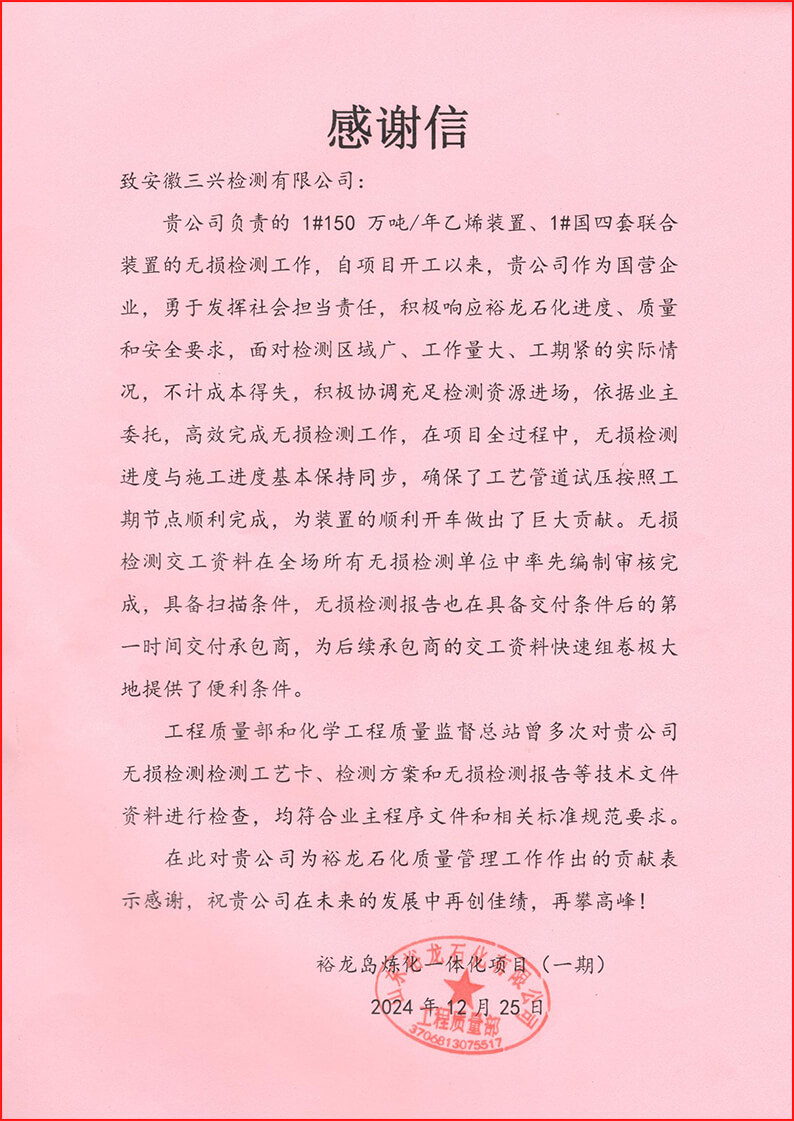近日,山东裕龙石化有限公司裕龙岛炼化一体化项目(一期)指挥部给米兰平台发来感谢信,对三兴检测公司高效完成项目1#150万吨/年乙烯装置、1#国四套联合装置无损检测工作、保障装置顺利投产表示衷心感谢。
