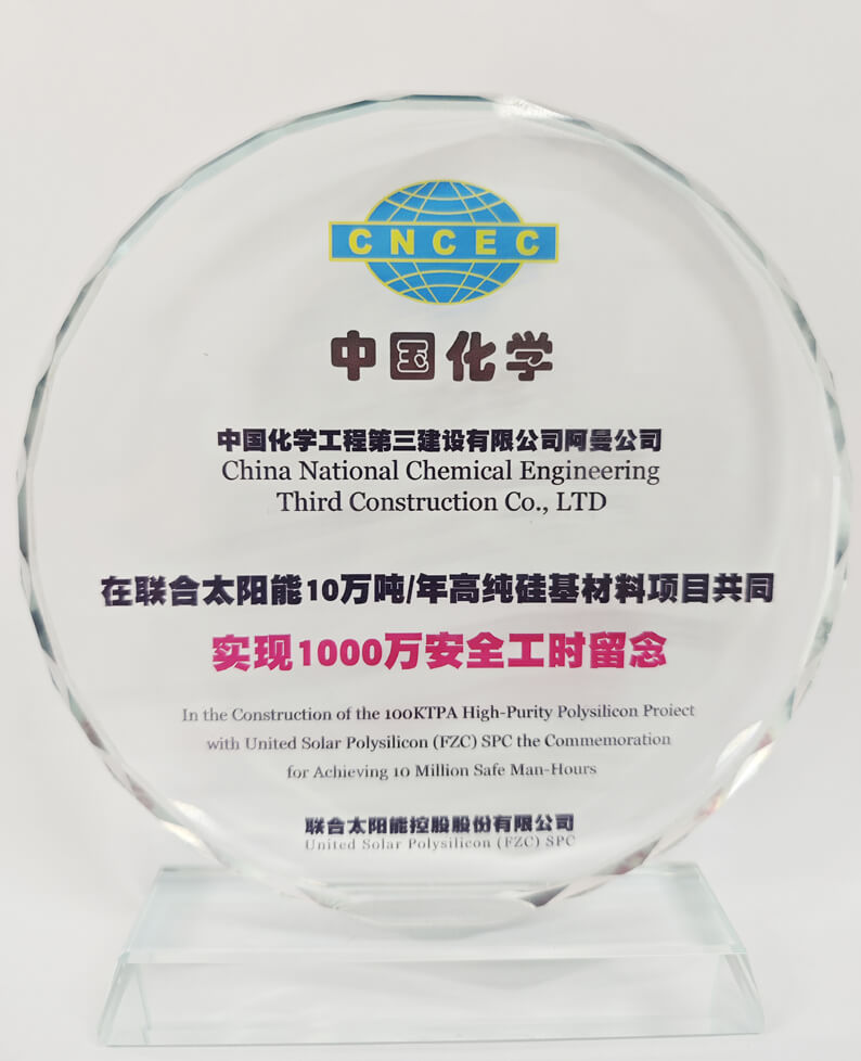 仪式上,业主联合太阳能有限公司对公司阿曼高纯硅基材料项目安全管理取得的成绩表示热烈祝贺,对现场全体员工安全、高效、快速推进项目建设表示衷心感谢,对项目“2024年度安全工作先进工作者”“2024年度安全工作优秀员工”“2024年度安全之星”进行了表彰,向阿曼公司颁发共同实现1000万安全工时奖牌,对阿曼公司在项目建设过程中坚持高标准、严要求,全面强化安全、质量及环保风险管控给予高度评价,希望公司进一步发挥示范引领作用,带动各参建单位加强安全管理,确保高质量达成各项关键节点目标。