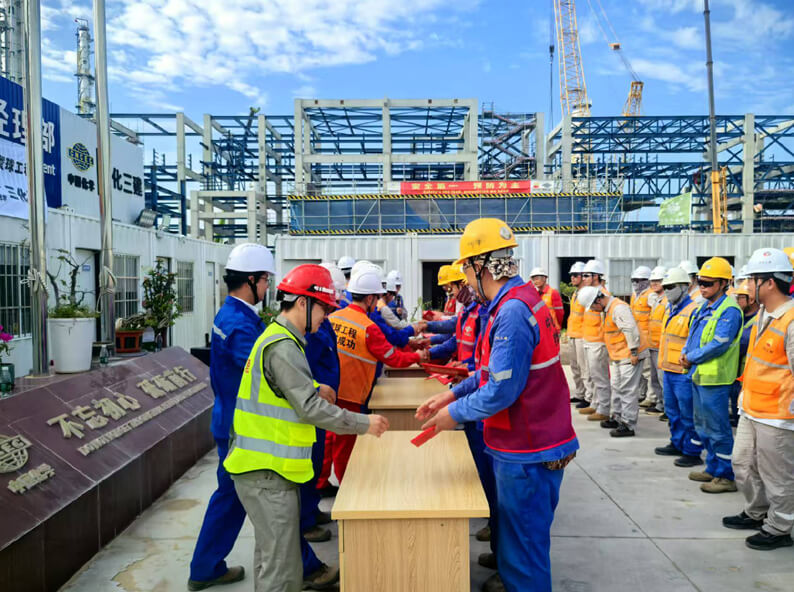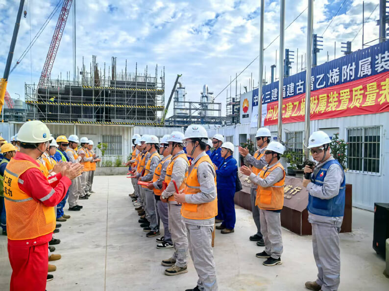 中沙石化有限公司乙烯分部负责人,监理单位、总包单位相关代表,项目部全体管理人员和一线员工代表参加大会。